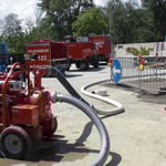 Dort angekommen, wurde unsere Sonderpumpe genau am selben Standort wie am vergangenen Dienstag aufgestellt. Diesmal galt es, das Wasser in der Kleingartensiedlung abzupumpen.