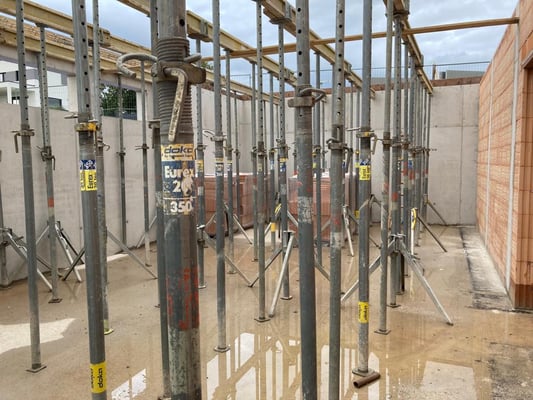 Deckensteher wurden aufgestellt und der Bitumenanstrich an der Außenseite angebracht. Mitte der Woche wurde die Schalung bei der Stiege fertiggestellt.